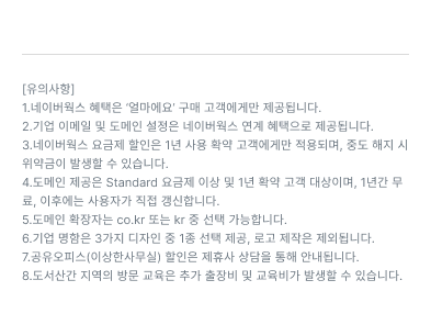 - 4. 도메인 제공은 Standard 요금제 이상 및 1년 확약 고객 대상이며, 1년간 무료, 이후에는 사용자가 직접 갱신합니다.