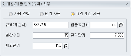 규격 계산은 면적이나 중량, 부피등으로 단가를 책정해야될때 사용하는 옵션입니다.