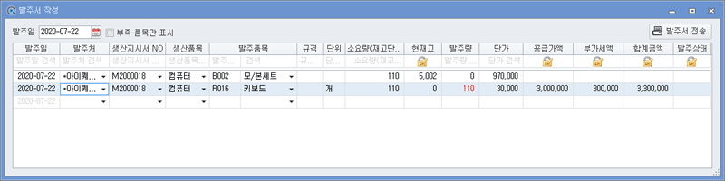 ㆍ발주서 작성 : 소요량과 현재고를 비교하여 부족수량이 있는 경우 발주서로 전송할 수 있습니다.