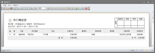 Ä«µå¸ÅÀÔÀå¿¡¼ ÀÔ·Â/Á¶È¸µÈ °Å·¡¸¦ ¸ðµÎ Ãâ·ÂÇÕ´Ï´Ù. ¶ÇÇÑ ½Å¿ëÄ«µå/°áÁ¦¾×ÀÇ ÃÑ ±Ý¾×À» ÇÕ°è·Î Ç¥½ÃÇϸç, Çö Àܾ׵µ ÇÔ²² Ç¥½ÃÇÔÀ¸·Î½á Ä«µå¸ÅÀÔÀÇ È帧À» ½±°Ô ÆÄ¾ÇÇÒ ¼ö ÀÖ½À´Ï´Ù.