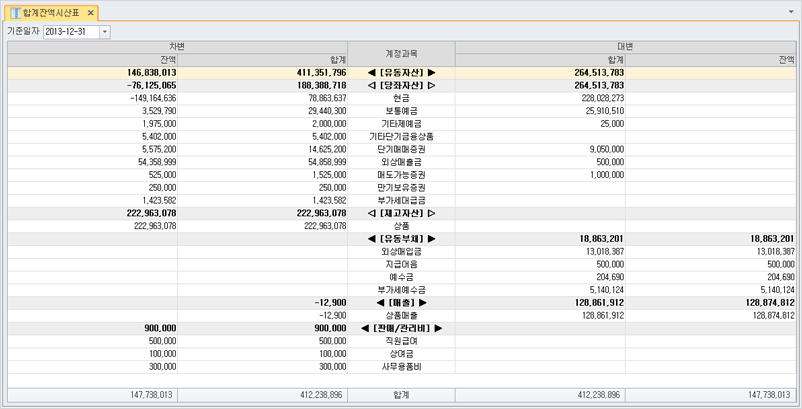 ÀÔ·ÂµÈ ÀÚ·áÀÇ ÇÕ°è¿Í Àܾ×À» Á¶È¸Çϴ ȸéÀÔ´Ï´Ù. °¢ °èÁ¤ÀÇ ±Ý¾×À» ÇÑ Ç¥¿¡¼ ´ëÁ¶, Áý°èÇÏ¿© Â÷º¯°ú ´ëº¯ÀÇ ±Ý¾×ÀÌ ÀÏÄ¡ÇÏ´ÂÁö È®ÀÎÇÕ´Ï´Ù. ÀÌ´Â ÃѰèÁ¤¿øÀåÀÇ Á¤(+), ºÎ(-)¸¦ ÀÚµ¿ÀûÀ¸·Î °ËÁõÇØ ÁÝ´Ï´Ù.