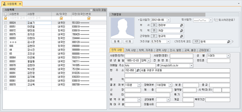 ¸ðµç »ç¿øÀ» µî·Ï/°ü¸®ÇÒ ¼ö Àִ ȸéÀÔ´Ï´Ù. ½Å±Ô»ç¿øÀÇ µî·ÏºÎÅÍ Åð»çÇÑ »ç¿øÀÇ Åð»ç󸮱îÁö °¡´ÉÇϰí, ¸ðµç »ç¿øÀÇ Á¤º¸¸¦ °ü¸®ÇÒ ¼ö ÀÖ½À´Ï´Ù.