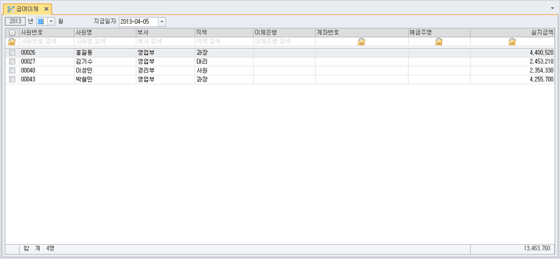 ±Þ¿©³»¿ªÀ» ÀÔ·ÂÇÑ »ç¿øÀÇ ÀÌüÀºÇà Á¤º¸ ¹× ±Þ¿©¾×À» Á¶È¸ÇÒ ¼ö Àִ ȸéÀÔ´Ï´Ù.