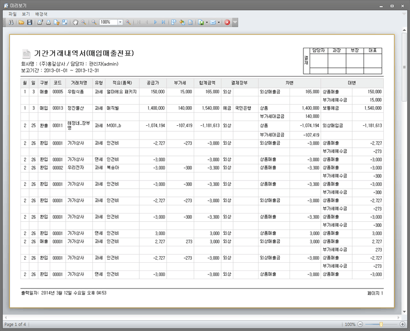 버튼 클릭으로 입력/조회한 일반전표 보고서를 출력 또는 거래처로 팩스전송 할 수 있습니다.
