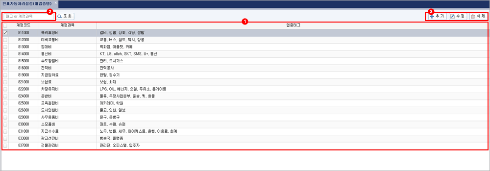 [세무신고]-[매입증빙]메뉴와 [재무],[부가서비스]-[카드 매입정보 불러오기]에서 전표처리를 하였을 때 가맹점명이 태그의 내용과 일치하는 부분이 있으면 자동으로 계정과목이 연결됩니다. 기본적인 태그는 등록이 되어있으며 원하는 내용으로 추가/수정/삭제할 수 있습니다.