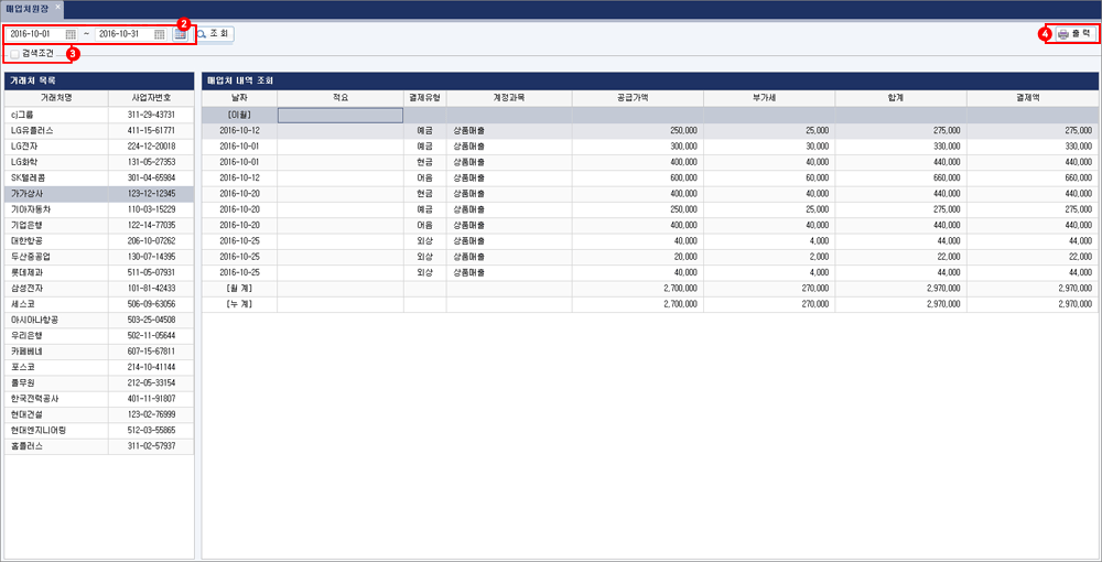 추가적으로 거래처명을 검색하여 해당 거래처의 내역만 확인할 수 있습니다. 거래처를 선택한 후