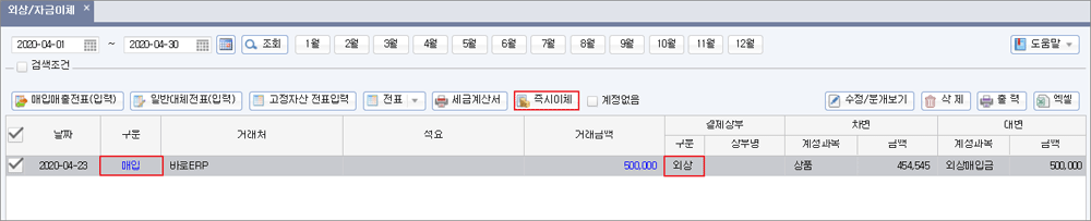 외상매입 전표를 선택하여 즉시이체 버튼을 클릭합니다.