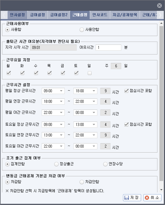 회사의 근무요일 설정할 수 있으며 설정된 요일은 정상근무일로 간주합니다.