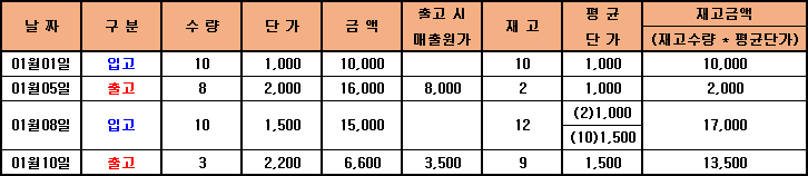 01월01일과 01월08일에 입고된 금액이 다르므로 단가가 각각 존재합니다. 평균단가의 ( )숫자는 해당 평균단가로 계산되는 재고수량입니다.