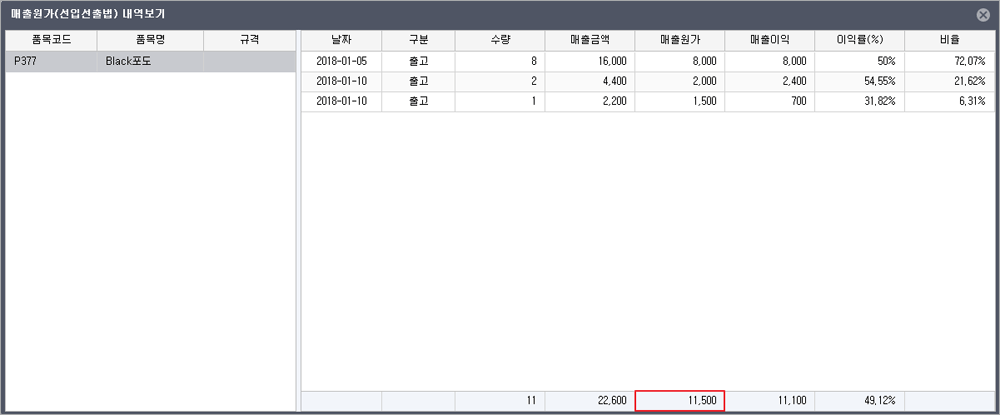 2. 매출원가(선입선출법) 내역보기 는 선입선출법으로 계산되어 해당 거래처의 출고거래별로 매출원가를 확인할 수 있습니다.