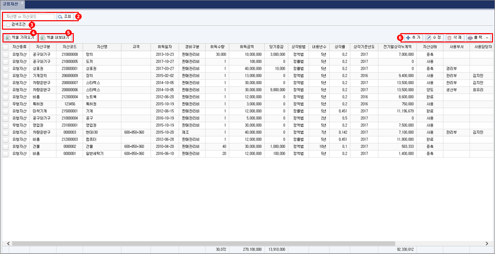 회사에서 취득한 업무용 자산을 등록 관리할 수 있는 화면으로, 자산의 등록, 수정, 삭제가 가능합니다.