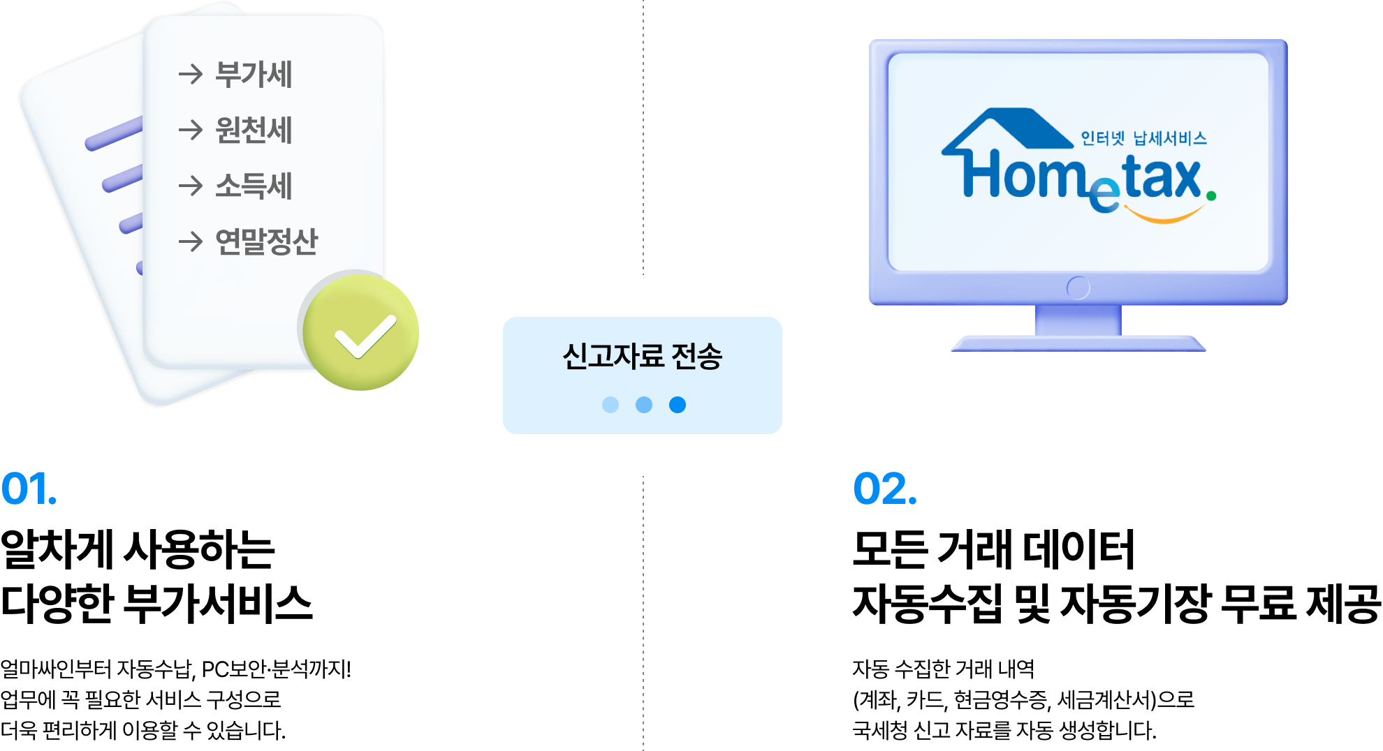 신용카드 사용 내역 및 카드매출 내역과 홈택스 매입매출 내역을 자동으로 수집하고 기장까지 처리해 줍니다.세금계산서